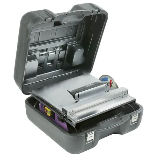 Des carters latéraux sont présents pour protéger de manière totale le disque de 180 mm de diamètre et un bac à eau vient le refroidir. La lame est également assistée par un couteau diviseur qui empêche tout blocage de cette dernière.